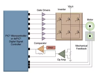 Microchip 無(wú)刷直流電機(jī)應(yīng)用還包括防鎖剎車(chē)系統(tǒng)、磁盤(pán)驅(qū)動(dòng)器伺服、油門(mén)控制等。