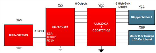 既然現(xiàn)在條件已成熟,您可連接MSP430 MCU、SN74HC595、ULN2003A和CSD17571Q2,創(chuàng)建一個(gè)靈活的電源結(jié)構(gòu),可在8通道的倍數(shù)中進(jìn)行擴(kuò)展,如圖5所示。