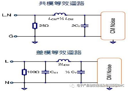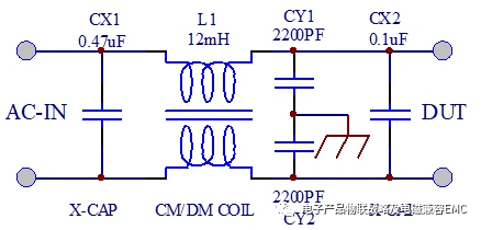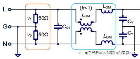 濾波器EMI-傳導(dǎo)的典型差模共模的等效設(shè)計圖如下: