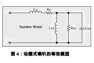 動圈式喇叭的阻抗特性可以使用圖4中的等效電路模型來模擬(等效電路模型的詳細分析請參見引用2)。其中: