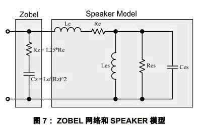 實際喇叭的高頻阻抗因為線圈電感而呈現(xiàn)隨頻率增高而上升的趨勢,由此導致了LC濾波網(wǎng)絡的高Q值。ZOBEL是和喇叭并聯(lián)的阻容網(wǎng)絡,它可以用來補償喇叭的感性而抑制喇叭阻抗的抬升。如圖7所示,ZOBEL網(wǎng)絡有電阻和電容組成。計算公式為(參見引用3):