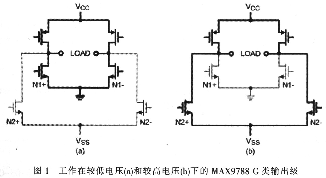 G類放大器MAX9730和MAX9788則以獨(dú)特的方式利用G類技術(shù),它們由電荷泵產(chǎn)生負(fù)壓,而非高、低正電源。當(dāng)放大器產(chǎn)生較小的輸出信號(hào)時(shí),放大器由電池電壓和地作為供電電源。這種模式下,器件的工作方式與常見(jiàn)的5 V AB類放大器(圖1a)類似。當(dāng)輸出信號(hào)超出電源電壓時(shí),放大器選擇電池電壓和負(fù)電荷泵輸出供電(圖1b)。由此,G類放大器的輸出信號(hào)遠(yuǎn)遠(yuǎn)高于傳統(tǒng)放大器的信號(hào)。