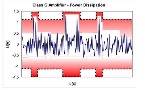 但是,這并不能掩蓋除了在高輸出電壓水平以外,晶體管仍然會消耗大量電能的事實。要解決這個問題,需要改變放大器本身的電源配置,這就是開發(fā)G類和H類放大器的原因。