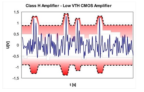 相對于G類放大器,H類放大器可根據(jù)輸出信號的要求平穩(wěn)地調(diào)節(jié)輸出電壓。因此,不同于G類放大器,H類放大器不受限于兩或三種固定輸出電壓。它能將來自降壓轉(zhuǎn)換器的最低允許電源電壓平穩(wěn)轉(zhuǎn)換為任意一種離散輸出電壓。