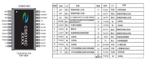 CS8316C是一款固定24倍增益,帶防破音,AB/D切換,功率限制,內(nèi)置BOOST升壓模塊并且升壓模塊具備自適應(yīng)升壓功能的R類單聲道音頻功率放大器。CS8316C可以驅(qū)動低至3Ω的負(fù)載,最大輸出25W的恒定功率.AB類D類可切換模式的設(shè)計(jì),最大限度的減少音頻子系統(tǒng)中功放對FM的干擾,CS8361C是專門為兩節(jié)鋰電池串聯(lián)供電的情況下設(shè)計(jì)的音頻放大器。CS8316C突破了鋰電池供電的局限性,為終端產(chǎn)品提供了更為極致的功率輸出,使得終端產(chǎn)品的功率輸出可以媲美12V鉛酸電池供電音頻系統(tǒng)的輸出功率. CS8316C的全 差分架構(gòu)和極高的PSRR有效地提高對RF噪聲的抑制能力。無需濾波器的PWM調(diào)制結(jié)構(gòu)及內(nèi)置的BOOST升壓模塊,以及CS8316C采用專有的AERC((Adaptive Edge Rate Control)技術(shù),在音頻全帶寬范圍內(nèi)極大地降低了EMI的干擾,對60cm的音頻線,在FCC的標(biāo)準(zhǔn)下具有超過20dB的裕量,另外CS8316C內(nèi)置了過流保護(hù),短路保護(hù)和過熱保護(hù),有效的保 護(hù)芯片在異常的工作條件下不被損壞。CS8316C提供了纖小的的TSSOP24-PP封裝形式供客戶選擇,其額定的工作溫度范圍為-40℃至85℃。