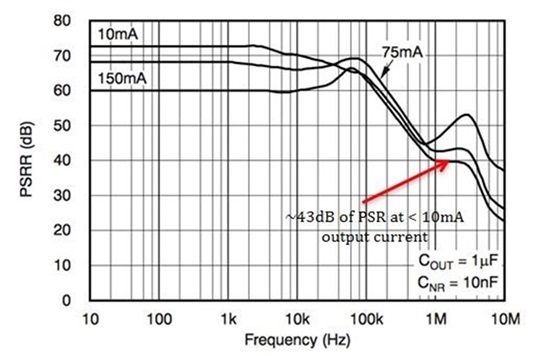 由于大多數(shù)傳感器中樞和子系統(tǒng)需要低電流,我們可以使用10mA負(fù)載來(lái)分析我們的信號(hào)。如果我們假定運(yùn)行頻率為2.1Mhz,TPS717具有多余的40dB PSR,這意味著LDO反射的紋波比SMPS反射的紋波低100倍。