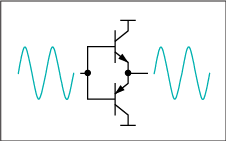 圖2 .B類音頻放大器中,輸出晶體管僅在信號(hào)波形的半周期(180°)期間導(dǎo)通。為放大整個(gè)信號(hào),使用兩個(gè)晶體管,其中一個(gè)在正向輸出信號(hào)導(dǎo)通,另一個(gè)在負(fù)向輸出信號(hào)導(dǎo)通。