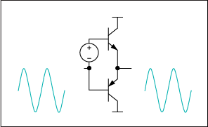 圖3. AB類放大器將兩個(gè)晶體管偏置,使其在信號(hào)接近零時(shí)能夠?qū)。所以這類放大器的效率比A類放大器高,失真比B類放大器小。