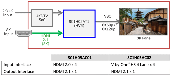 “SC1H05AT1”支持8K內(nèi)容處理功能,能滿足全球市場對8K內(nèi)容播放日益增長的需求。SC1H05AT1可兼容HDMI2.0/2.1和V-by-One接口,內(nèi)置的升級功能和Socionext獨自研發(fā)的高畫質(zhì)技術(shù)將Full HD(2K)、4K視頻內(nèi)容得以在8K面板上以最佳畫質(zhì)回放。
