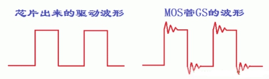 我們測死MOS管GS波形時(shí),有時(shí)會(huì)看到下圖中的這種波形,在芯片輸出端是非常好的方波輸出,但一旦到了MOS管的G極就出問題了,有振蕩,這個(gè)振蕩小的時(shí)候還能勉強(qiáng)過關(guān),但是有時(shí)候振蕩特別大,看著都教人擔(dān)心會(huì)不會(huì)重啟。