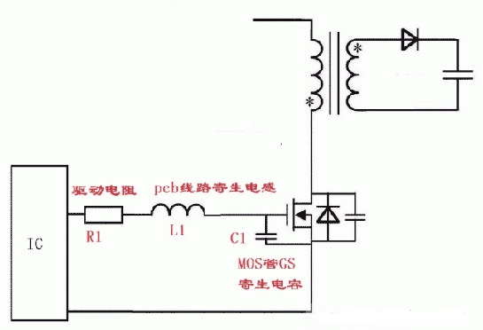 IC出來的波形正常,到C1兩端的波形就有振蕩了,實(shí)際上這個(gè)振蕩就是R1,L1和C1三個(gè)元器件的串聯(lián)振蕩引起的,R1為驅(qū)動(dòng)電阻,是我們外加的,L1是PCB上走線的寄生電感,C1是mos管gs的寄生電容。