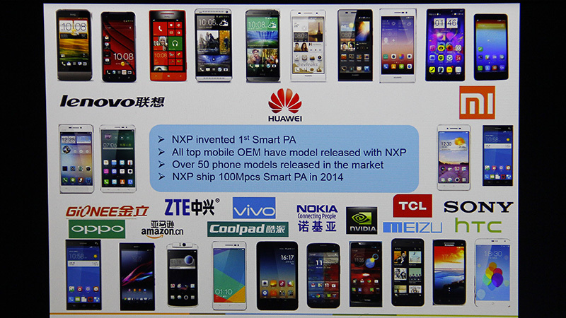 據(jù)Steve透露目前幾乎所有中國(guó)一線手機(jī)廠商大量旗艦機(jī)都采用了恩智浦的智能功放產(chǎn)品,2014年恩智浦功放出貨一億以上,包括小米、HTC、VIVO、聯(lián)想、華為、魅族、中興、金立、酷派等都在使用,有50款機(jī)型采用了這個(gè)智能功放。