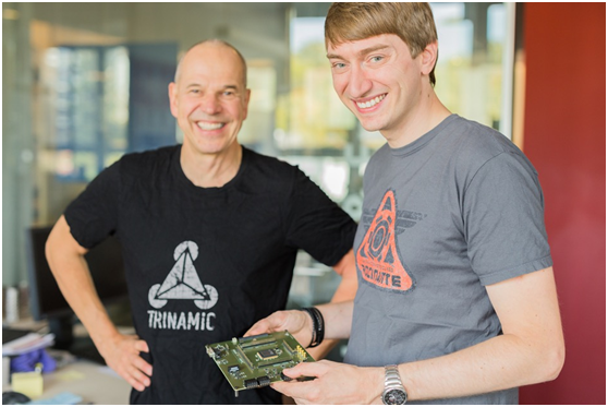 圖1 TRINAMIC首席執(zhí)行官MichaelRandt和Onno Martens博士展示全球首款RISC-V電機(jī)驅(qū)動(dòng)器芯片。