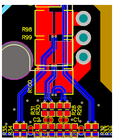 為了能夠準(zhǔn)確的采樣電流,應(yīng)將運(yùn)放芯片在PCB上的位置盡量靠近采樣電阻,同時又要使運(yùn)放芯片不能遠(yuǎn)離MCU,運(yùn)放的地和MCU的地應(yīng)該盡量靠攏。如圖3所示,采樣電阻(R98、R99、R100)兩端走差分線到運(yùn)放的同相和反相端口,差分線應(yīng)等距并且盡量短,以避免其他的干擾產(chǎn)生。壓縮機(jī)涉及到高壓和低壓部分,在布局電流地的時候,應(yīng)使大電流地和小電流地能很好的單點(diǎn)隔離。