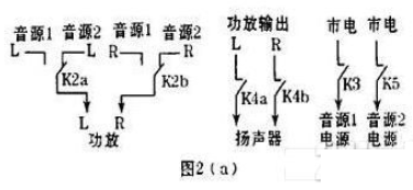 2.音源選擇:按開/選擇鍵,IC2第13腳先輸出低電平,使紅色LED6點亮作電源接通顯示,并使V4導(dǎo)通,K1得電吸合,將功放電源接通。3秒后第13腳恢復(fù)為高電平,第14腳轉(zhuǎn)為低電平,使綠色LED7點亮作音源1接通顯示,V5導(dǎo)通,使K2、K3得電吸合,接通圖2(a)中的音源1信號和電源。因VD2作用,V4仍導(dǎo)通,使K1吸合接通功放電源。同時經(jīng)VD8也使K4得電吸合接通揚聲器。