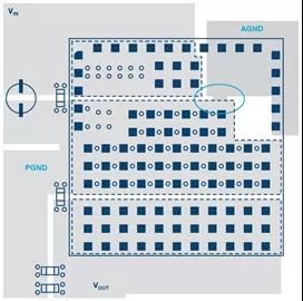 圖2.分開(kāi)的AGND和PGND在接地標(biāo)簽下方利用過(guò)孔連接。