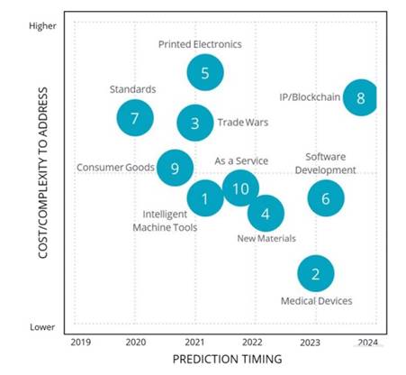 IDC 3D打印預(yù)測已根據(jù)不同主題進(jìn)行分類,如下圖所示; 預(yù)測也編號(hào)用于識(shí)別。