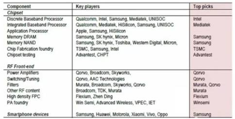 5G將極大推動移動互聯(lián)網(wǎng)發(fā)展并促進(jìn)開發(fā)如4K視頻和VR/AR等新功能。因此,關(guān)鍵的半導(dǎo)體供應(yīng)鏈部件將獲得額外的收入,比如分立基帶(Discrete B), 應(yīng)用處理器 (AP), 射頻前端 (RF Front-end),天線(Antenna)和功放(PA)將會受益。伴隨高速網(wǎng)絡(luò)下載大容量文件的需要,5G的閃存用量將比4G增長43%。至2022年5G不斷成熟,類似應(yīng)用處理器)/基帶/存儲器等半成品增長空間將逐漸消失,但由于物聯(lián)網(wǎng)接入終端的普及,射頻將仍有增長潛力。表1是摩根大通整理的主要受益的半導(dǎo)體公司清單: