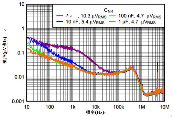 為該引腳添加一個電容器(CNR/SS),就可以形成具有內(nèi)部電阻的RC濾波器,有助于把由參考電壓生成的無用噪聲分流。由于參考電壓是噪聲的主要來源,增加電容可推送左側(cè)低通濾波器的截止頻率。圖 4 顯示了該電容器對輸出噪聲的作用結(jié)果。