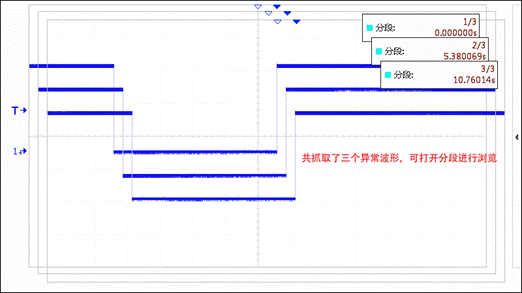 如何多次采集異常?設(shè)置Normal觸發(fā),點(diǎn)RUN運(yùn)行,多次采集后手動(dòng)停止,打開分段存儲(Seg),可瀏覽所有捕獲到的異常。