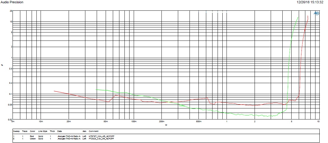 3. 整個頻段THD測試,F(xiàn)T2925低頻失真度小,HT878高頻失真度小。