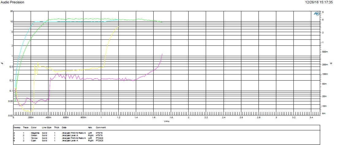 2. 防破音打開之后,HT878輸出功率也比FT2925大,失真度比FT2925小。