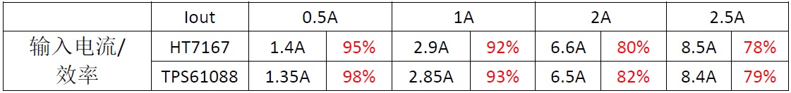 1. 效率對比:HT7167 跟 TPS61088 效率差別不大,低一到兩個點。