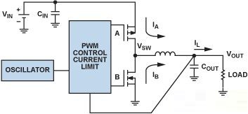 在圖 3 中,開關(guān) A 和開關(guān) B 分別利用 PFET 和 NFET 開關(guān)實(shí)現(xiàn),構(gòu)成一個(gè)同步降壓調(diào)節(jié)器!巴健币辉~表示將一個(gè) FET 用作低端開關(guān)。用肖特基二極管代替低端開關(guān)的降壓調(diào)節(jié)器稱為“異步”(或非同步)型。處理低功率時(shí),同步降壓調(diào)節(jié)器更有效,因?yàn)?FET 的壓降低于肖特基二極管。然而,當(dāng)電感電流達(dá)到 0 時(shí),如果底部 FET 未釋放,同步轉(zhuǎn)換器的輕載效率會(huì)降低,而且額外的控制電路會(huì)提高 IC 的復(fù)雜性和成本。