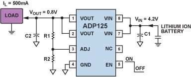 電池的續(xù)航時(shí)間是新型便攜式設(shè)備設(shè)計(jì)高度關(guān)注的一個(gè)特性。提高系統(tǒng)效率可以延長(zhǎng)電池工作時(shí)間,降低更換或充電的頻度。例如,一個(gè)鋰離子充電電池可以使用ADP125 LDO以 0.8 V電壓驅(qū)動(dòng)一個(gè) 500 mA負(fù)載,如圖 6 所示。該LDO的效率只有 19% (VOUT/VIN × 100% = 0.8/4.2 × 100%)。LDO無法存儲(chǔ)未使用的能量,因此剩余的 81%的功率(1.7 W)只能以熱量形式在LDO內(nèi)部耗散掉,這可能會(huì)導(dǎo)致手持式設(shè)備的溫度迅速上升。如果使用ADP2138 開關(guān)調(diào)節(jié)器,在 4.2 V輸入和 0.8 V輸出下,工作效率將是 82%,比前一方案的效率高出 4 倍多,便攜式設(shè)備的溫度升幅將大大減小。這些系統(tǒng)效率的大幅改善使得開關(guān)調(diào)節(jié)器大量運(yùn)用于便攜式設(shè)備。