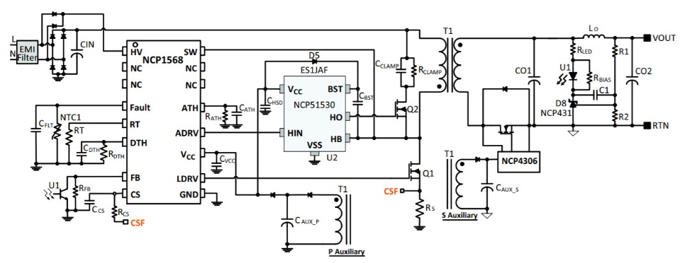 安森美半導(dǎo)體將NCP1568和NCP51530搭配,通過結(jié)合一個(gè)高能效的拓?fù)?ACF)和減小器件大小的高頻工作,滿足當(dāng)前市場(chǎng)的需求。雖然這些優(yōu)勢(shì)是通過可靠的和已證實(shí)的硅基超級(jí)結(jié)FET實(shí)現(xiàn)的,但只要成熟,該方案也兼容GaN器件。