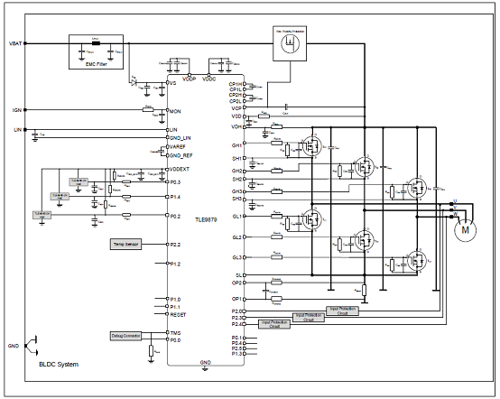 The TLE9879QXA20 is part of the TLE987x product family. The TLE9879QXA20 is a single chip 3-Phase motor driver that integrates the industry standard ARM® Cortex™ M3 core, enabling the implementation of advanced motor control algorithms such as field-oriented control. It includes six fully integrated NFET drivers optimized to drive a 3-Phase motor via six external power NFETs, a charge pump enabling low voltage operation and programmable current along with current slope control for optimized EMC behavior. Its peripheral set includes a current sensor, a successive approximation ADC synchronized with the capture and compare unit for PWM control and 16-bit timers. A LIN transceiver is also integrated to enable communication to the device along with a number of general purpose I/Os. It includes an on-chip linear voltage regulator to supply external loads.