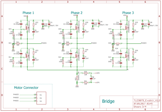 All relevant chip pins are connected to pin headers at the edge of the board, where signals can be probed or applied directly. By different jumper settings LEDs can be put in parallel to several ports and selected functions can be configured. Push button switches allow easy hardware reset and triggering of the MON input. There are intended test points for all six gate driver pins, for measurements at the shunt, VDDC and several ground points on the evaluation board (see Figure 3). For testing analog signals ADC inputs can be varied by the potentiometer on board. Three phases of motor current can be picked off at a terminal block to connect a DC brushless motor.