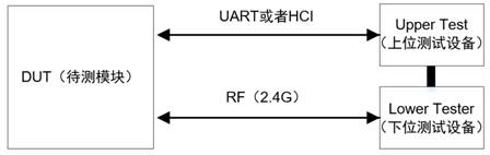 DTM測試的硬件接線如下圖,DUT可以理解為藍(lán)牙產(chǎn)品,Upper Test可以理解為電腦上的一個上位機(jī)應(yīng)用,Lower Tester可以理解為插在電腦上一個標(biāo)準(zhǔn)射頻的藍(lán)牙模塊,這種方法簡單、方便。或者Upper Test和Lower Tester可以理解成一個帶藍(lán)牙射頻的功能強(qiáng)大的綜合測試儀,這種方法專業(yè)、可靠,但是儀器價(jià)格昂貴。