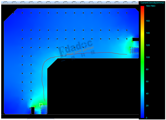 如圖所示,上面是一個(gè)電源平面,標(biāo)識(shí)出來(lái)的路線是電流密度最高的部分,綠色部分是電源到回流地平面的最近路徑。從上面可以看出,越近的路徑上,通過(guò)的電流越多一些,電流就像我們?nèi)艘粯,也是比較喜歡走捷徑的,都想挑電阻比較小的路徑通過(guò),保存實(shí)力到用電端。這個(gè)特性就會(huì)導(dǎo)致部分區(qū)域的電流密度偏大以及部分過(guò)孔通過(guò)的電流比較大。所以并不是按照經(jīng)驗(yàn)公式添加相應(yīng)數(shù)量的過(guò)孔,電流就會(huì)按照平均分配的方式通過(guò)過(guò)孔。這就導(dǎo)致一些過(guò)孔通過(guò)的電流超過(guò)能力范圍,可能板子使用一段時(shí)間之后,過(guò)孔中間會(huì)斷裂,影響過(guò)孔壽命,也影響板子的使用周期。所以對(duì)于一些大電流的電源,過(guò)孔加的整整齊齊可能反而會(huì)影響過(guò)孔電流的大小,這時(shí)候加過(guò)孔是有技巧的,也是靠近電源輸出的過(guò)孔電流會(huì)越大,這種情況就建議通過(guò)仿真來(lái)指導(dǎo)添加過(guò)孔陣列。對(duì)于電流密度而言也是一樣,電源輸出端和用電端之間最近的路徑上,電流密度會(huì)比較大,如果最近的路徑上正好是瓶頸區(qū)域的話,需要修改電源路徑。
