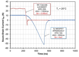 圖4:反向恢復(fù)特性比較:SiC共源共柵與Si-MOSFET。