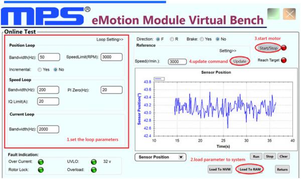 用戶只需要將MMP7xxxxx模塊與上位PC連接,然后使用鼠標(biāo)操作便可以通過(guò)MPS友好的用戶界面對(duì)控制模塊的每一個(gè)寄存器進(jìn)行讀寫(xiě)操作,以及完成對(duì)控制程序的升級(jí)和燒寫(xiě)。用戶還可以選定特點(diǎn)的電機(jī)輸出量后觀察將其在GUI窗口內(nèi)的實(shí)時(shí)波形進(jìn)行調(diào)試。MPS的動(dòng)態(tài)GUI 可以讓實(shí)時(shí)硬件操作如同運(yùn)行仿真一般簡(jiǎn)便。
