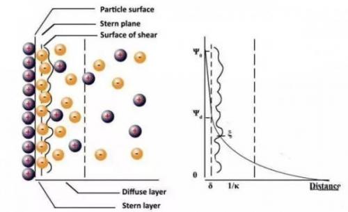 下圖為Stern雙電層模型,zeta電位(ξ,Zeta potential)為雙電層模型中極重要的參數(shù),實(shí)際測(cè)量時(shí)并無(wú)法直接測(cè)得粒子的表面電位,但可由聲波法或是電泳法計(jì)算出粒子的zeta電位。雙電層模型中Stern 層與擴(kuò)散層間的剪切平面上存在zeta電位。