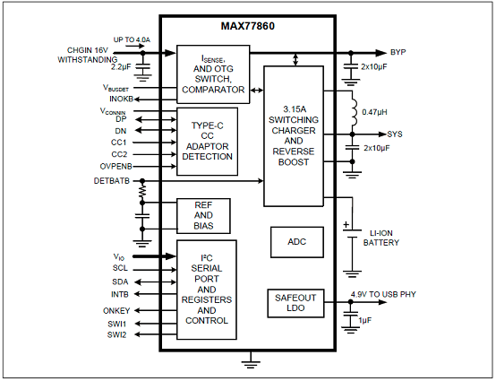 This switched-mode battery charger with two integrated switches, provides small inductor and capacitor sizes, programmable battery charging current, and is ideally suited for portable devices such as smartphones, IoT devices, and other Li-ion battery powered electronics. The charger features a single input, which works for both USB and high voltage adapters. It supports USB Type-C CC detection under BC 1.2 specification, and the power-path switch is integrated in the chip. All MAX77860 blocks connected to the adapter/USB pin are protected from input overvoltage events up to 14V. The USB-OTG output provides true-load disconnect and is protected by an adjustable output current limit. It has an input current limit up to 4.0A, and can charge a single-cell battery up to 3.15A. When configured in reverse-boost mode, the IC requires no additional inductors to power USB-OTG accessories. The switching charger is designed with a special CC, CV, and die temperature regulation algorithm, as well as I2C programmable settings to accommodate a wide range of battery sizes and system loads. The on-chip ADC can help monitor the charging input voltage/current, battery voltage, charging/discharging current, and the battery temperature.