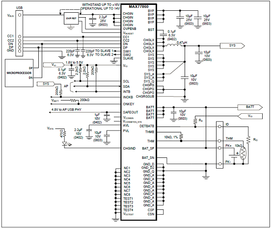 Maxim公司的MAX77860是USB Type-C 3A開(kāi)關(guān)模式降壓充電器,集成了CC檢測(cè)和BC1.2檢測(cè)和ADC.該充電器集成了兩個(gè)開(kāi)關(guān),使用小型電感和電容尺寸,可編程充電電流,非常適合用在手持設(shè)備如智能手機(jī),IoT設(shè)備和其它鋰電池電子設(shè)備.充電器具有單輸入,可工作于USB和高壓適配器.支持BC 1.2標(biāo)準(zhǔn)下的USB Type-C CC檢測(cè),芯片還集成了電源通路開(kāi)關(guān),USB-OTG輸出提供真負(fù)載斷開(kāi)功能,并可調(diào)整輸出電流限制,而輸入電流限制高達(dá)4.0A,單電池充電電流高達(dá)3.15A;當(dāng)配置在反向升壓模式,器件就不需要另外電感器.高達(dá)14V保護(hù),充電器具有D+/D-充電檢測(cè),CC,CV和芯片溫度控制,主-從充電功能,高達(dá)6A充電電流,支持USB-OTG反向升壓,高達(dá)1.5A電流限制.本文介紹了MAX77860主要優(yōu)勢(shì)和特性,框圖和功能框圖,典型應(yīng)用電路圖以及評(píng)估板MAX77860 EVK主要特性,電路圖,建立圖和材料清單.