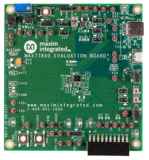 The MAX77860 evaluation system (EV system) is a fully assembled and tested surface-mount printed circuit board (PCB) that evaluates the single input switched-mode battery charger featuring USB Type-C CC detection and charging capability in addition to reverse boost capability and a safest LDO.