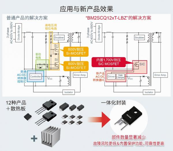 本產(chǎn)品采用一體化封裝,相比采用Si-MOSFET的普通分立結(jié)構(gòu),部件數(shù)量顯著減少,1個(gè)封裝內(nèi)包含多達(dá)12種產(chǎn)品(AC/DC轉(zhuǎn)換器控制IC、800V耐壓Si-MOSFET×2、齊納二極管×3、電阻器×6)和散熱板。另外,由于SiC MOSFET具有高耐壓、抗干擾性能優(yōu)異的特點(diǎn),還可實(shí)現(xiàn)降噪部件的小型化。