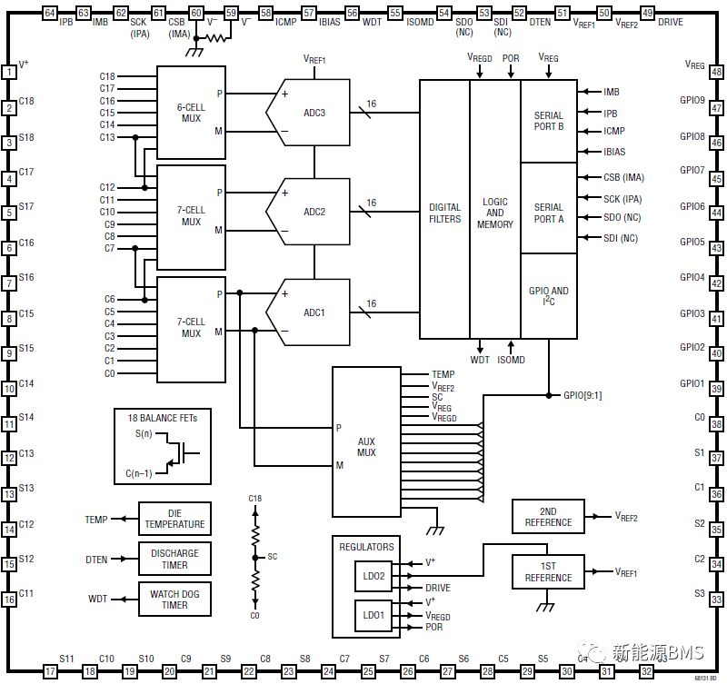 上圖是ADI的LTC6813的內(nèi)部功能框圖,目前市面上可以接觸到的AFE內(nèi)部結構大同小異,不同點更多是集中在硬件資源方面;還有的話就是針對功能安全要求所設計的架構形式。簡單來講,最主要的不同點是采樣通道數(shù)量、內(nèi)部ADC的數(shù)量、類型與架構(關于ADC這一塊,后面可以單獨拿出來討論)。