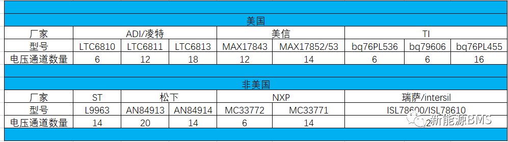 目前可供我們選擇的車規(guī)AFE資源是有一些的(如下表),可能有些信息不太準確,有些還處于樣片階段,僅供參考。里面把美國和非美國的器件分了類,其實NXP和瑞薩與美國的關系也比較密切,有些說不清。國內(nèi)的AFE起步有點晚,可以看到實際上車的幾乎沒有。
