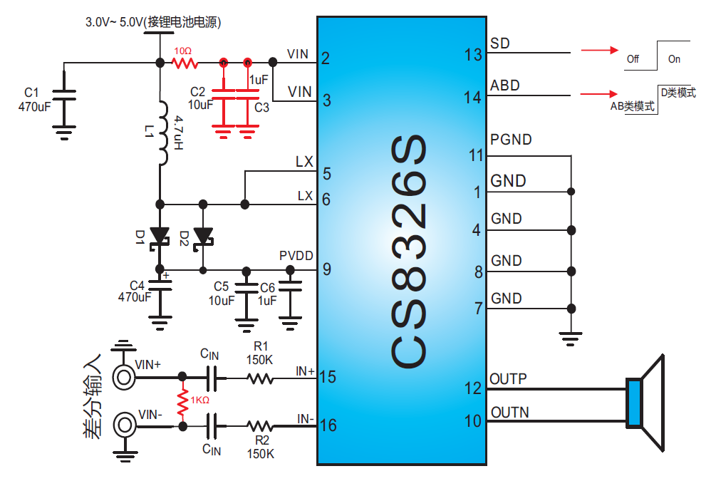 內(nèi)置BOOST升壓、恒定5.0W輸出功率、AB類/D類切換單聲道音頻功放IC |