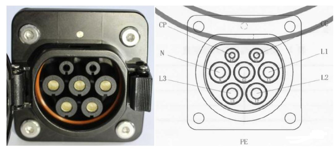 先看一下車輛插座處定義,如下圖所示,它共有7個引腳,其中CC為充電連接確認(rèn)引腳,CP為充電導(dǎo)引引腳。插頭與插座在互插過程中,PE最先連接,確保有一個穩(wěn)定的地平臺;CCCP最后連接,類似于高壓互鎖確認(rèn)功能;拔出時,順序則相反。