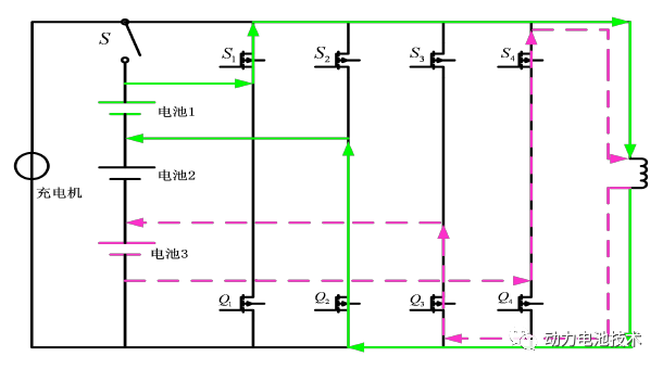 充電過程中,開關(guān)管 S 閉合,充電機(jī)給電池組充電。此時電池組右側(cè)開關(guān)管全部斷開,均衡系統(tǒng)不開啟。設(shè)單體電池B1 電壓開始明顯高于其他電池并達(dá)到均衡閾值時,此時均衡系統(tǒng)開啟,S1、Q2開關(guān)管閉合,電感與單體電池 B1 并聯(lián),起到分流的作用,電感儲存來自充電機(jī)與電池 B1 的能量;當(dāng) S1、Q2 開關(guān)管置 0,Q3、S4 開關(guān)管置 1 時,電感給充電過程的單體電池 B3 釋放一定能量。