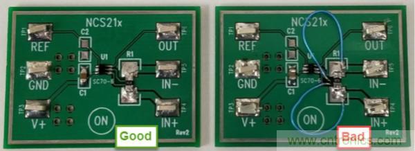 圖2:NCS213R客戶評估板:正確與錯(cuò)誤的分路連接對比