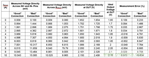 這運(yùn)用主要是要說明,并聯(lián)電阻檢測線連接很重要,不能隨意地進(jìn)行。從直接實(shí)驗(yàn)和觀察可以明顯看出,未經(jīng)優(yōu)化的檢測線連接引入了不可接受的誤差。同樣值得注意的是,在連接“錯(cuò)誤”的板上,在輸入引腳處測量的數(shù)據(jù)與在并聯(lián)電阻兩端測量的結(jié)果相比有很大的差異。并聯(lián)電阻兩端的測量結(jié)果與預(yù)期一樣,但直接在輸入引腳處的測量值則不是這樣。由于雜散電阻的增加,輸入引腳處的電壓較高。 |