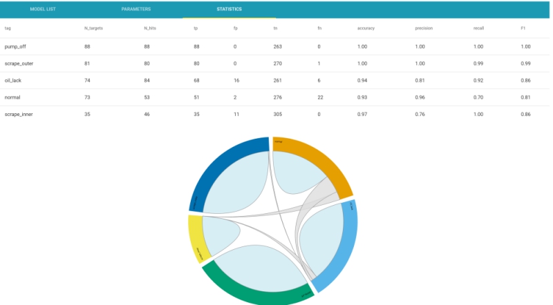 在任何時(shí)候,都可以創(chuàng)建異常模型或事件識(shí)別模型。事件識(shí)別模型是一個(gè)圓形的混淆矩陣,它允許 OtoSense 用戶探索混淆事件。