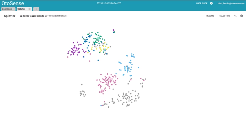 OtoSense Sound Platter(也稱為 splatter)允許通過完整概述數(shù)據(jù)集來探索和標(biāo)記聲音。Splatter 在完整的數(shù)據(jù)集中選擇最有趣和最具代表性的聲音,并將它們顯示為一個(gè)混合了標(biāo)記和未標(biāo)記聲音的 2D 相似性地圖。